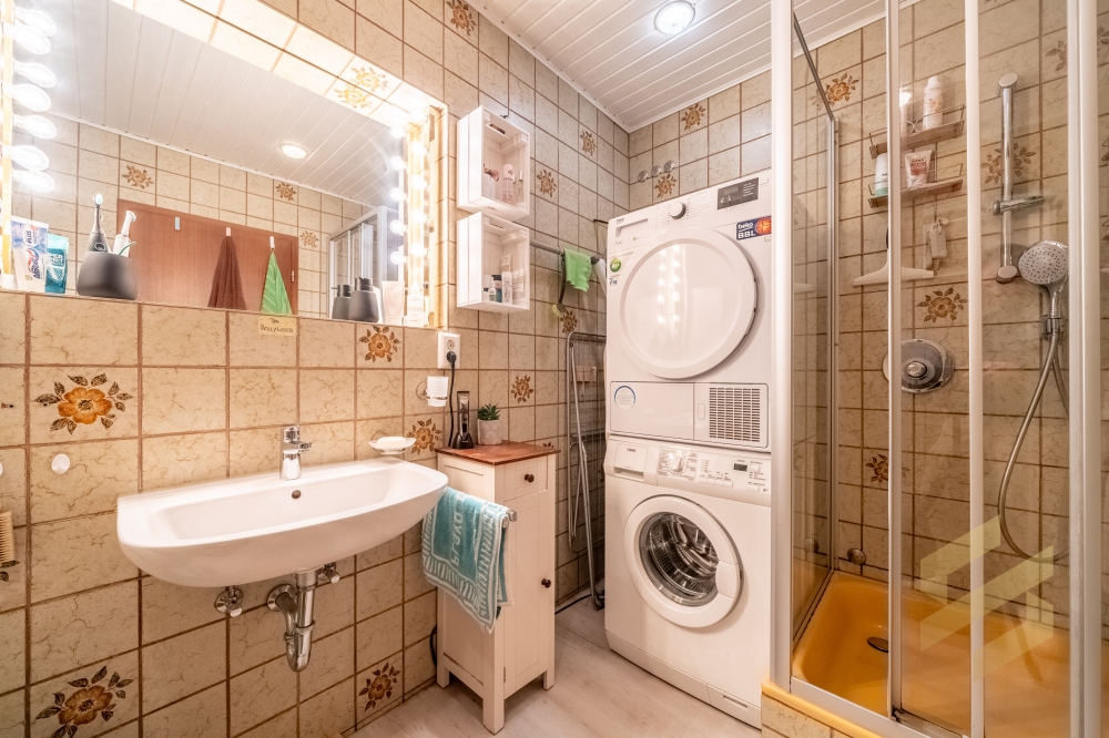 - Badezimmer (~6 qm): Das Tageslichtbad ist mit einer Dusche ausgestattet und bietet einen eigenen Anschluss für Waschmaschine und Trockner direkt in der Einheit.